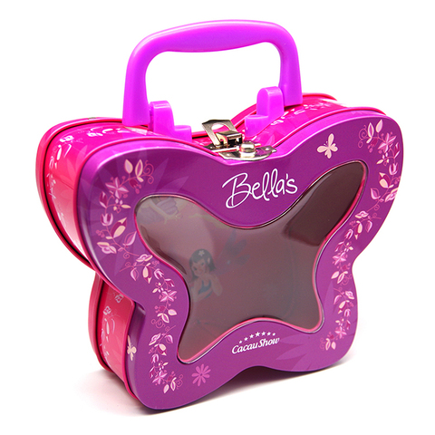 Chine Usine Personnalisé Imprimé De Qualité Supérieure En Forme De Papillon Cadeau Poignée Boîte En Fer Blanc Avec Poignée Et Fenêtres EN PVC